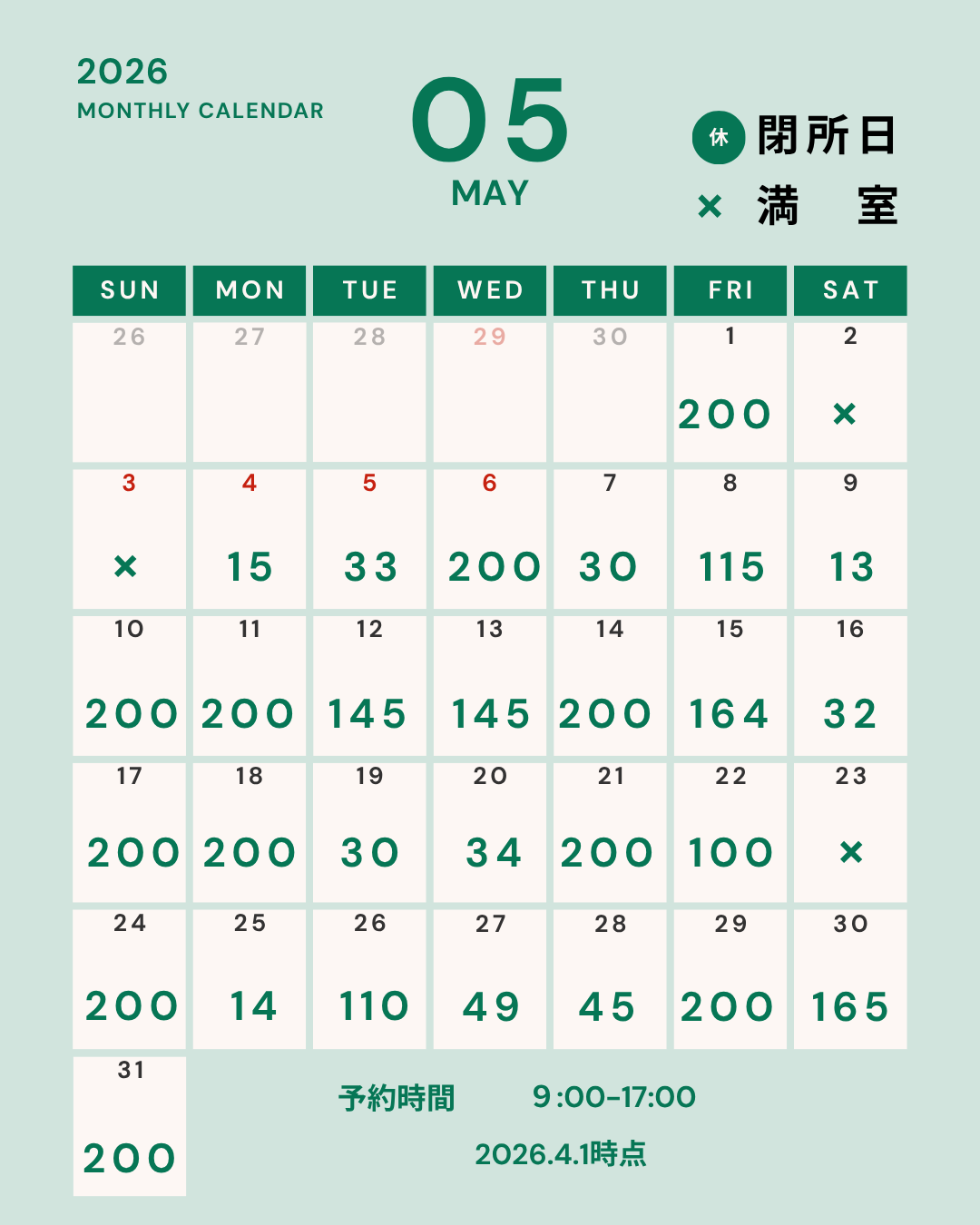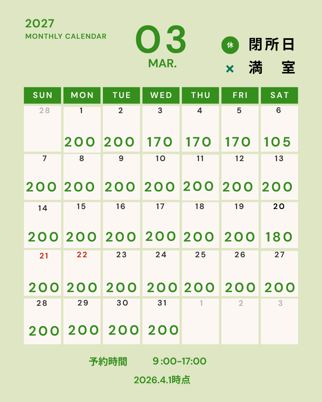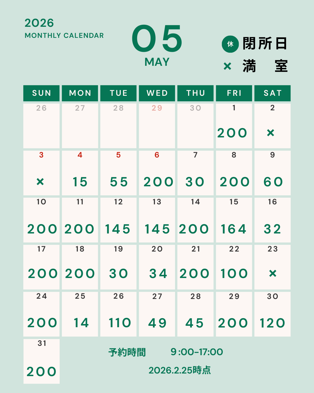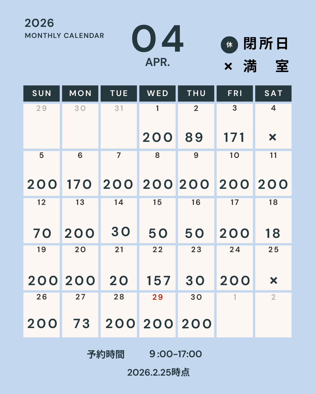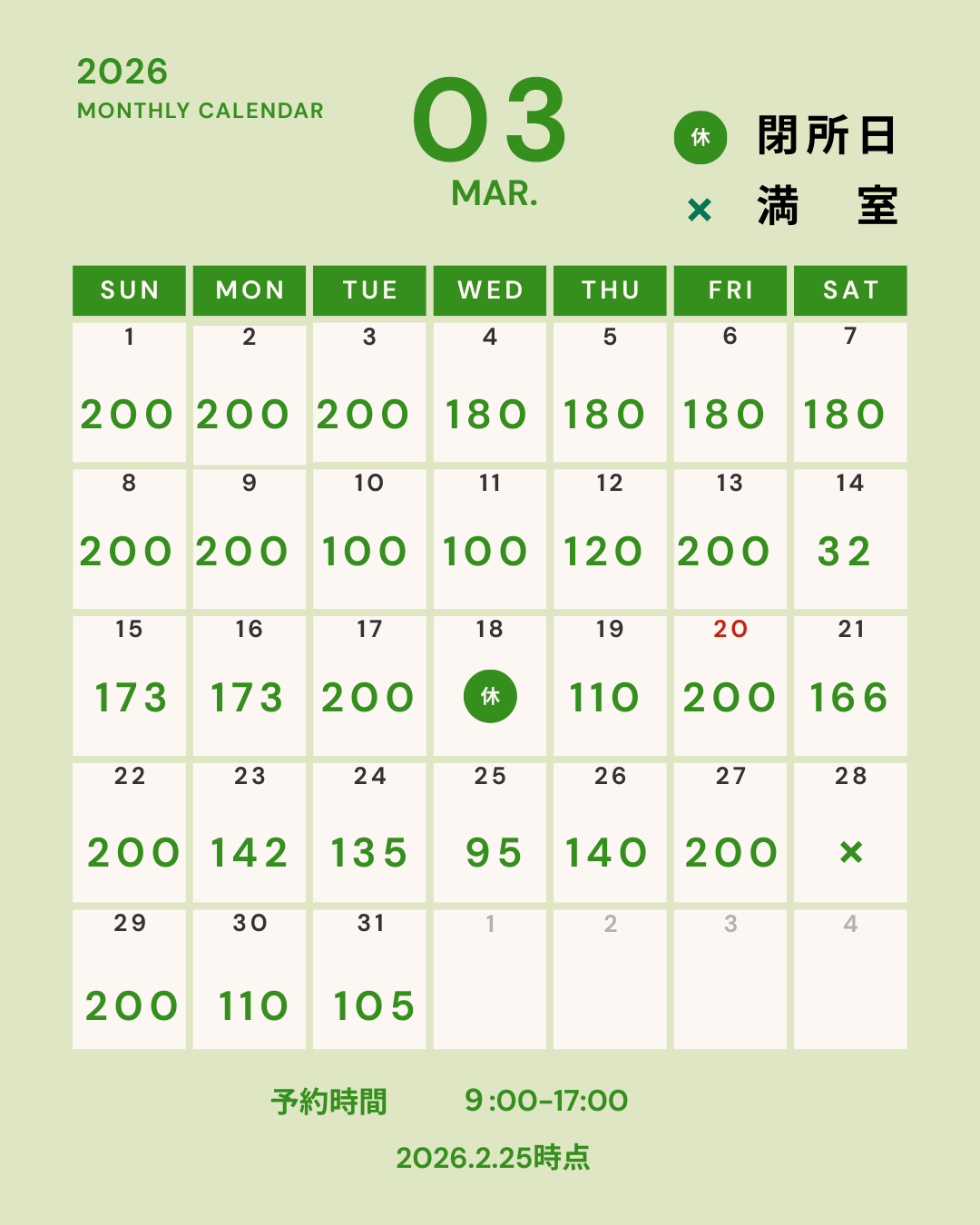 令和8年3月18日施設点検の為閉所日となります。 - 2026.2.26 キャンセルポリシーの内容が一部変更となりました。