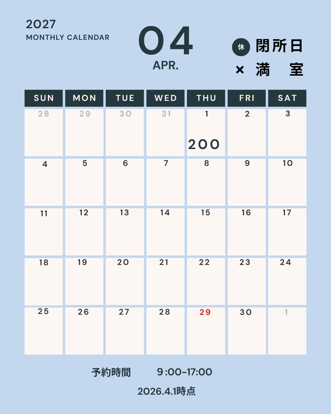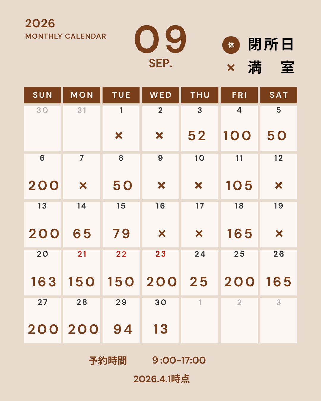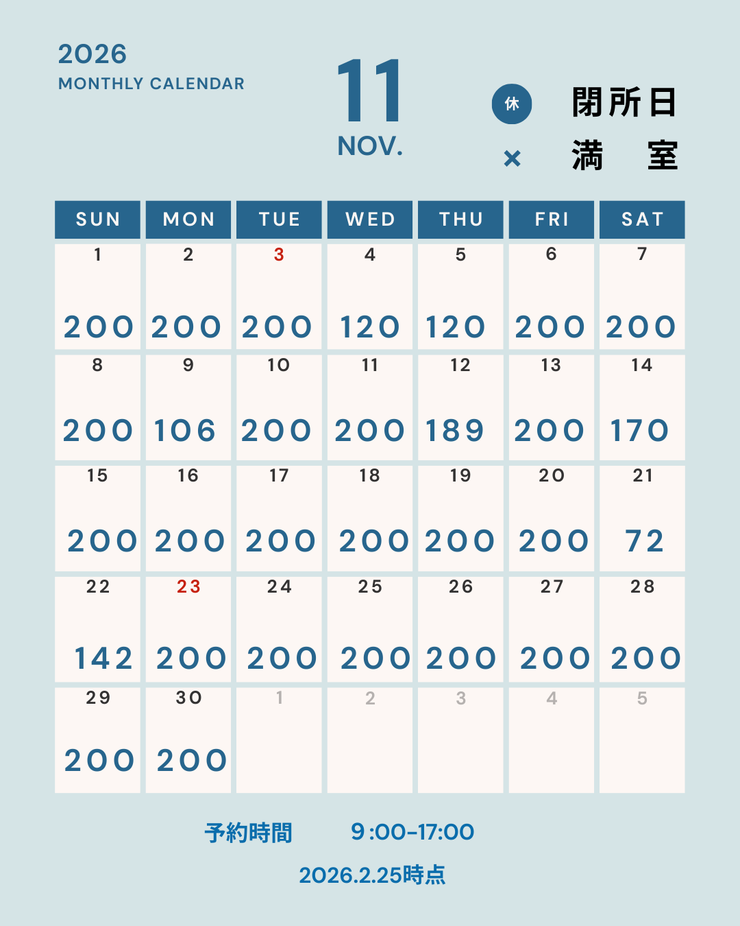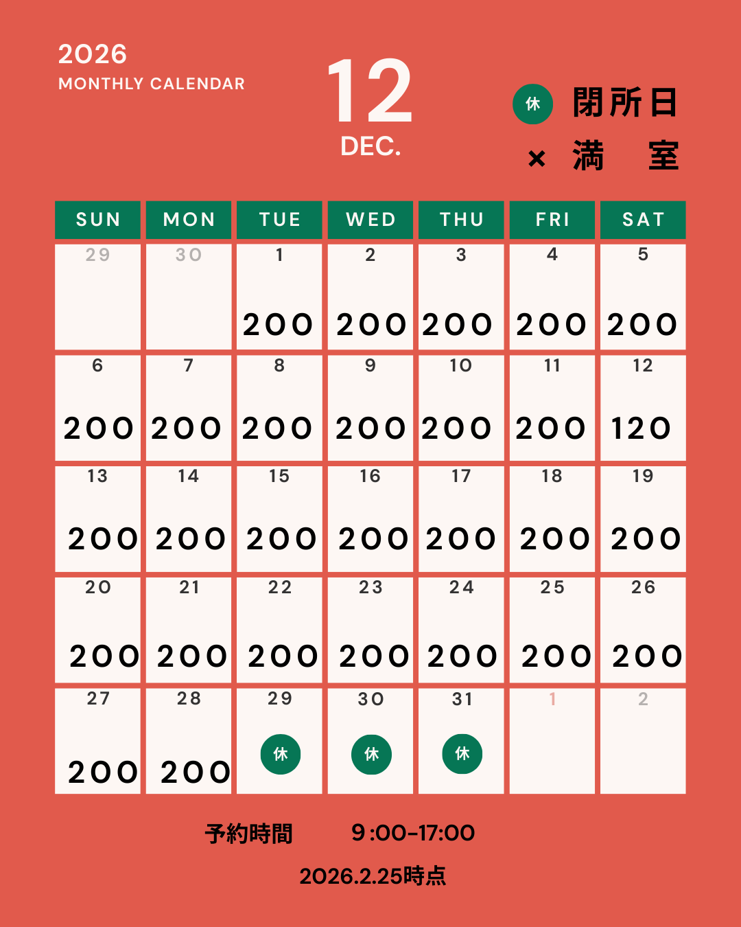 令和8年3月18日施設点検の為閉所日となります。 - 2026.2.26 キャンセルポリシーの内容が一部変更となりました。