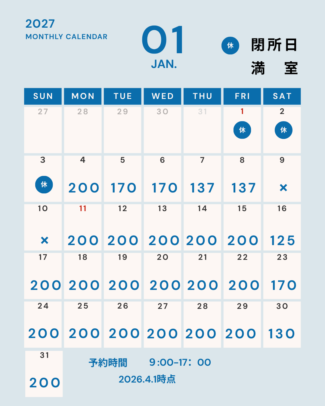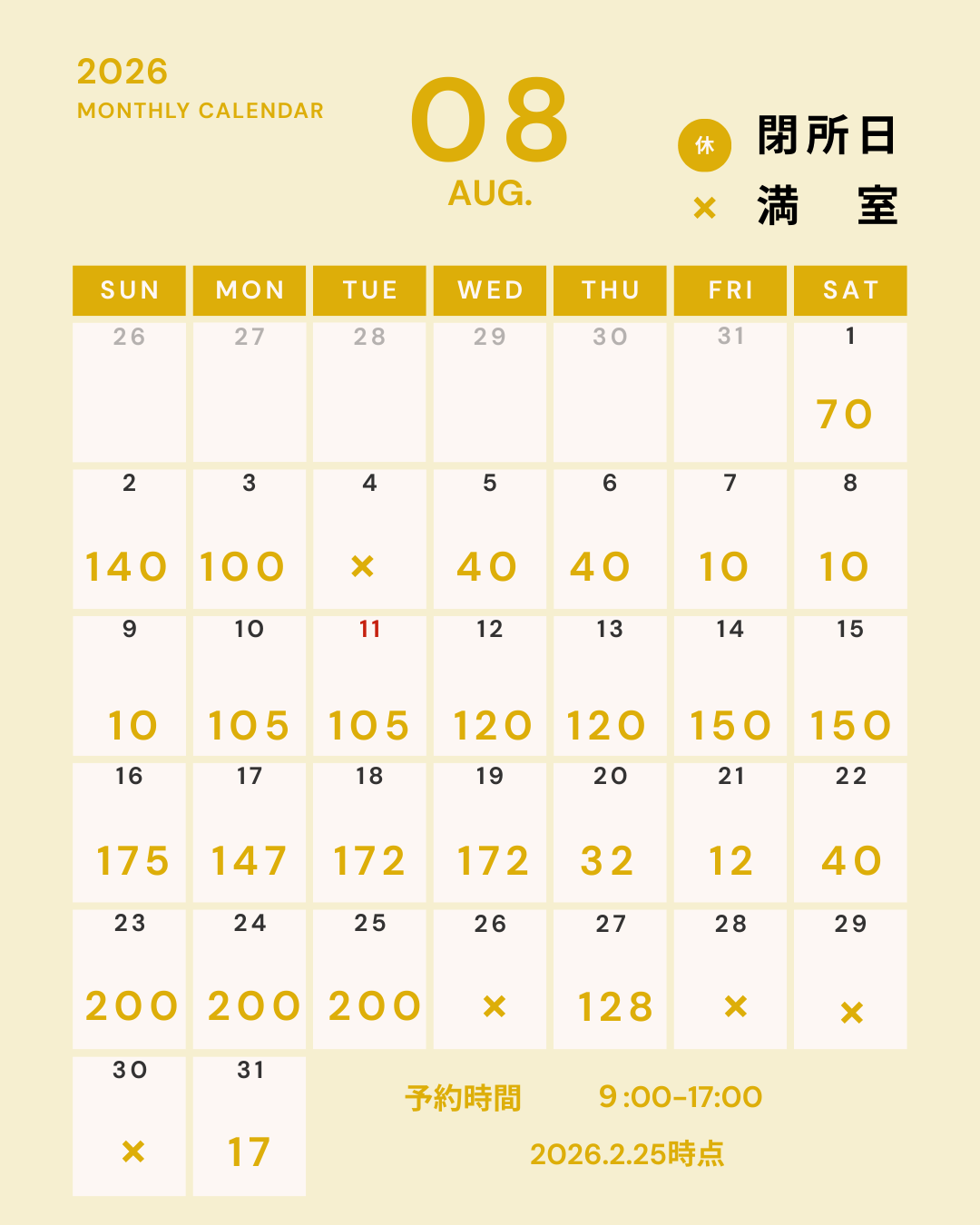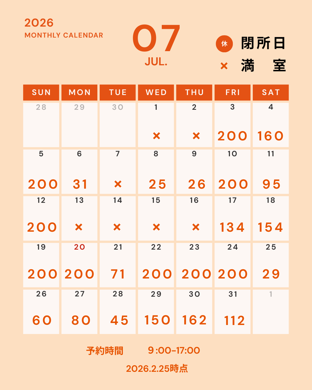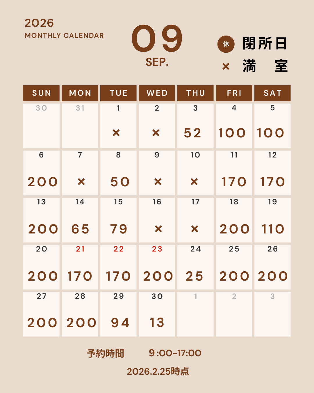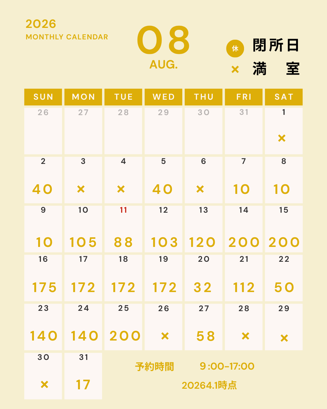 令和8年3月18日施設点検の為閉所日となります。 - 2026.2.26 キャンセルポリシーの内容が一部変更となりました。
