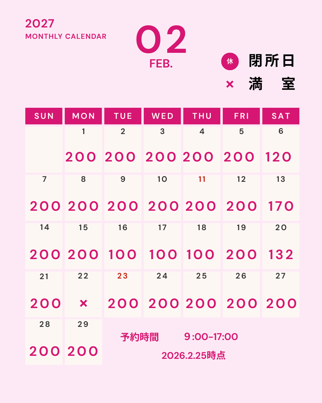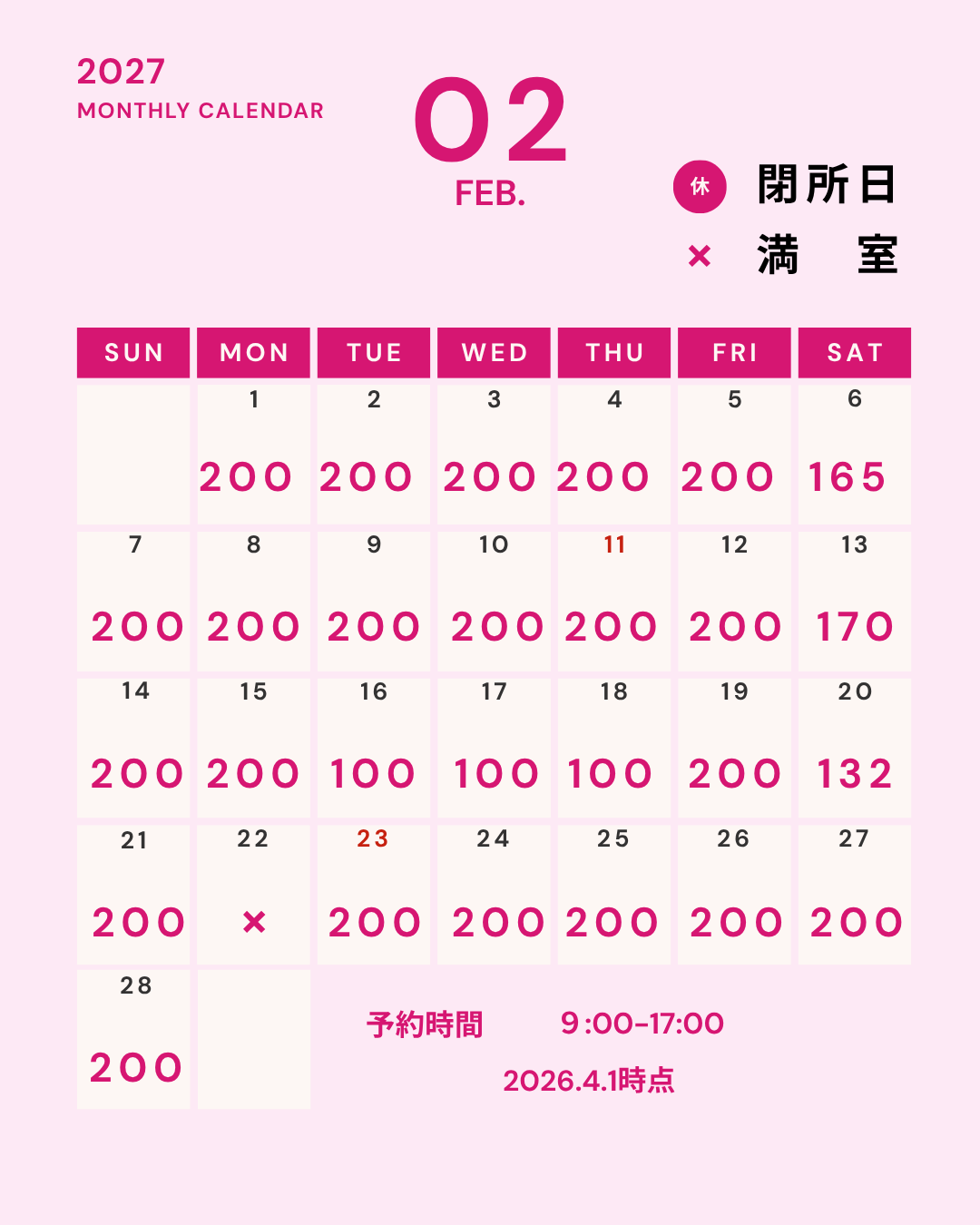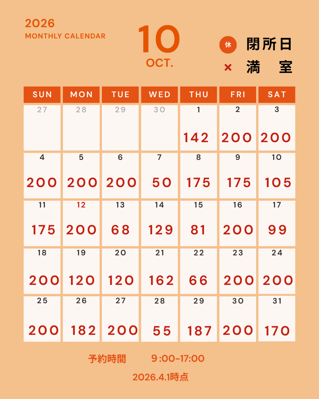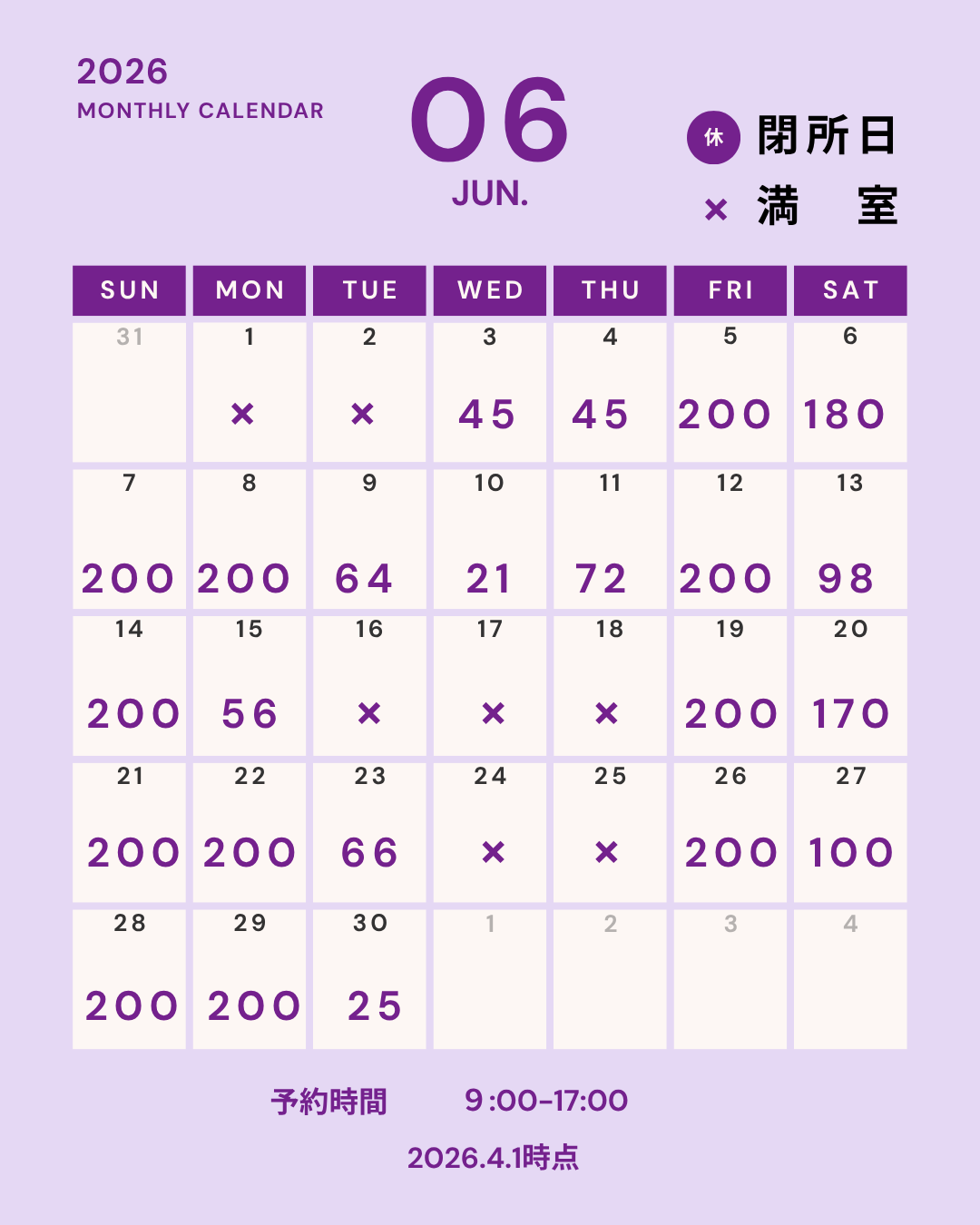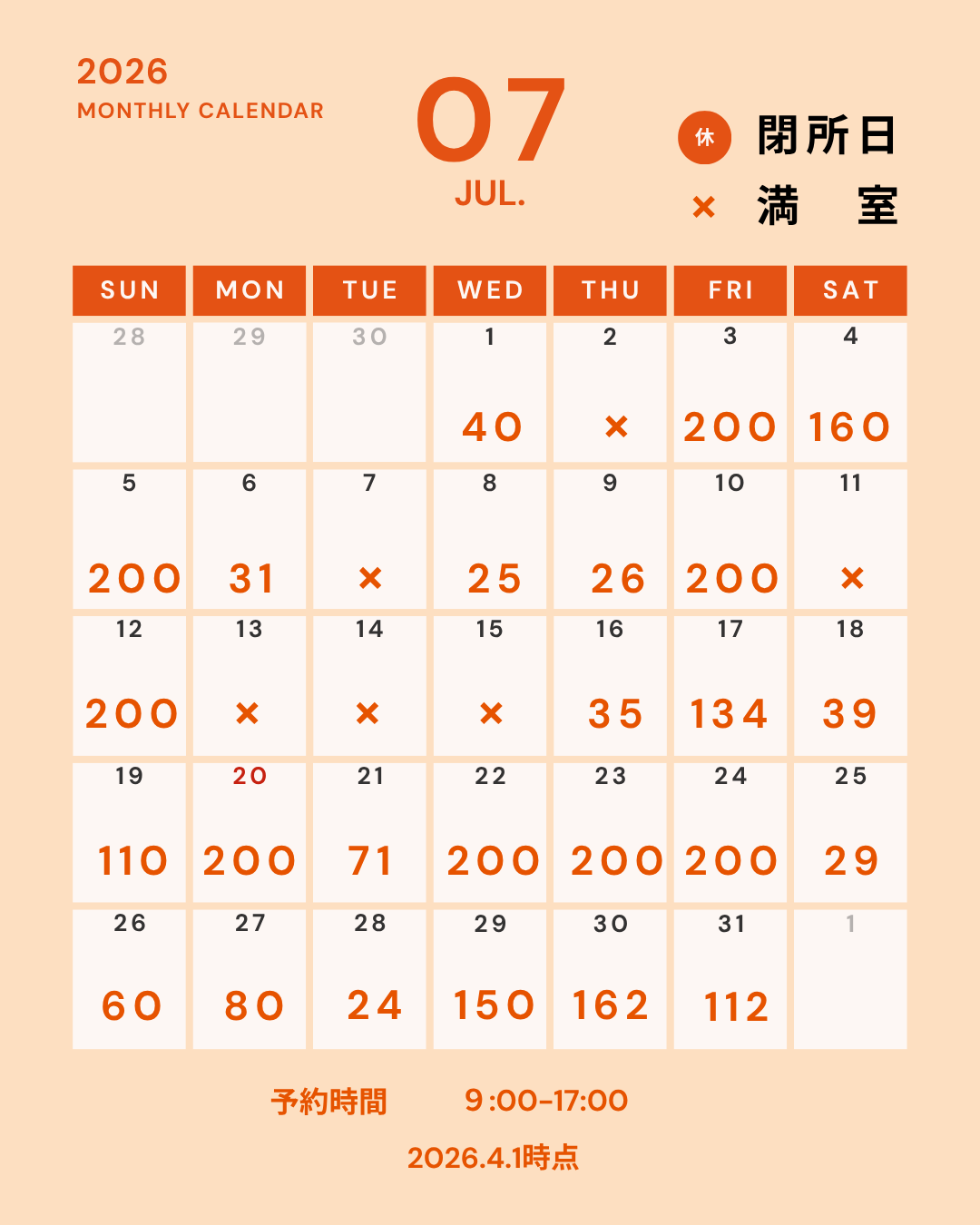 令和8年3月18日施設点検の為閉所日となります。 - 2026.2.26 キャンセルポリシーの内容が一部変更となりました。